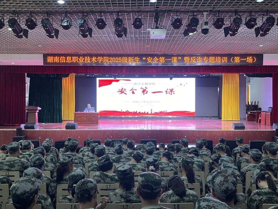 近日,我院电子工程学院2025级新生身着迷彩服,满怀期待地参加新生军训动员大会时,一场专为他们量身打造的反诈主题宣传教育活动同步开启。近400名新生在开启军训生活的同时,率先补上了“大学安全必修课”。