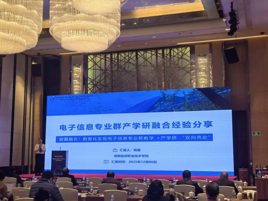 名师工作室教师代表以《破圈融合!数智化实现电子信息专业教学与产学研“双向奔赴”》为题,从名师工作室推动教学创新和专业群建设服务人才培养的双重视角出发,系统介绍了湖南信息职院电子信息工程技术专业群在课程重构、教学模式改革及产学研协同育人等方面的探索路径与初步成效。