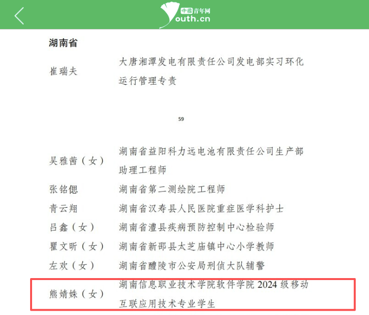 近日,共青团中央授予我院软件学院移动互联应用技术专业熊婧姝同学“全国优秀共青团员”称号。该奖项是共青团系统授予团员的最高荣誉。熊婧姝是湖南省高职院校及长沙市学生团员中唯一获此殊荣者。