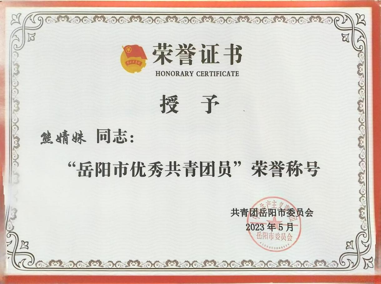 熊婧姝曾获“岳阳市优秀共青团员“荣誉称号