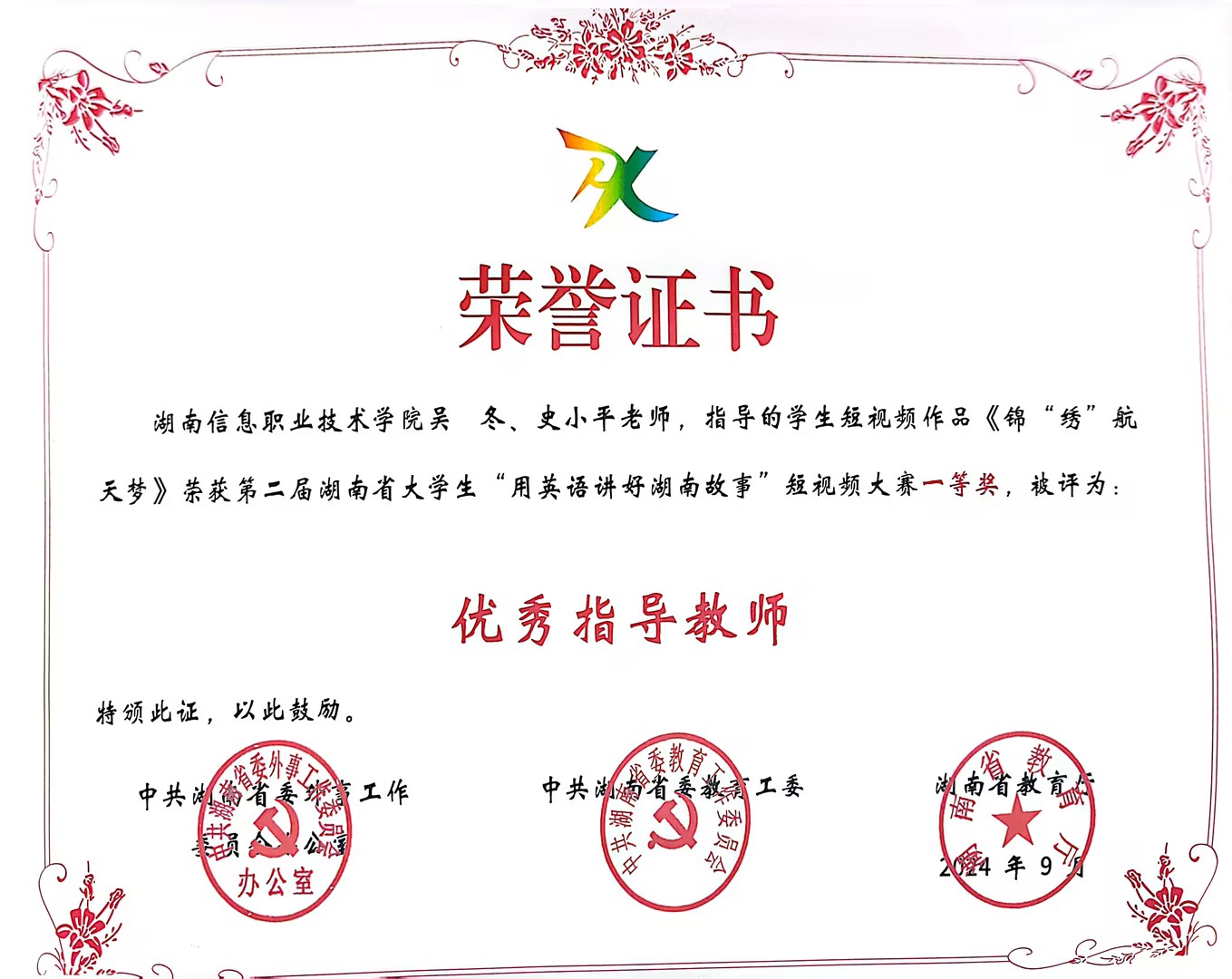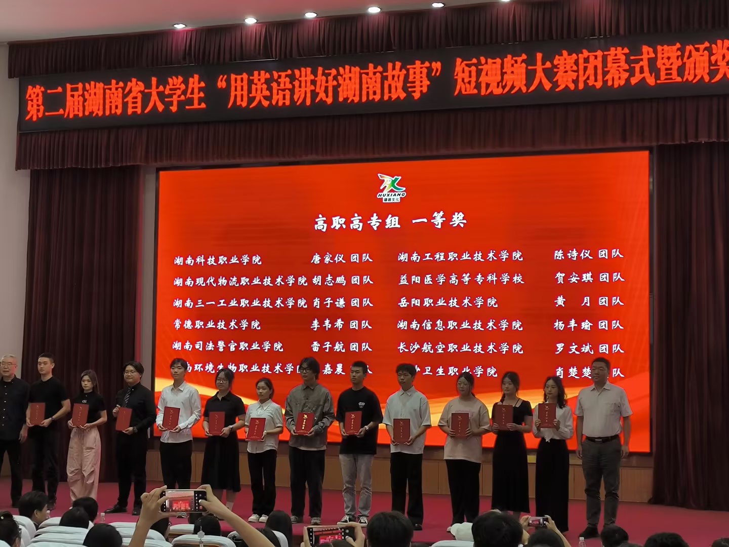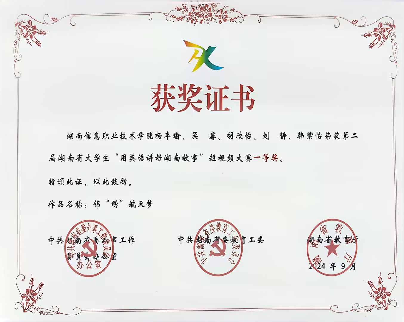 近日,由中共湖南省委教育工委、湖南省教育厅主办的第二届湖南省大学生“用英语讲好湖南故事”短视频大赛闭幕式暨颁奖典礼顺利举行。我院杨丰瑜、吴骞、胡欣怡、刘静、韩紫怡团队作品《锦“绣”航天梦》获高职高专组一等奖。张垚、朱凯文、冯姝慧、刘芳团队作品《科创赋能非遗 湘韵绣美共融》获高职高专组三等奖。