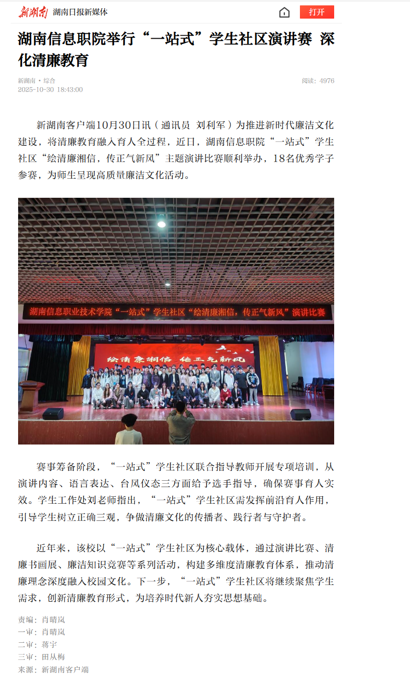 10月30日,新湖南发布《湖南信息职院举行“一站式”学生社区演讲赛 深化清廉教育》