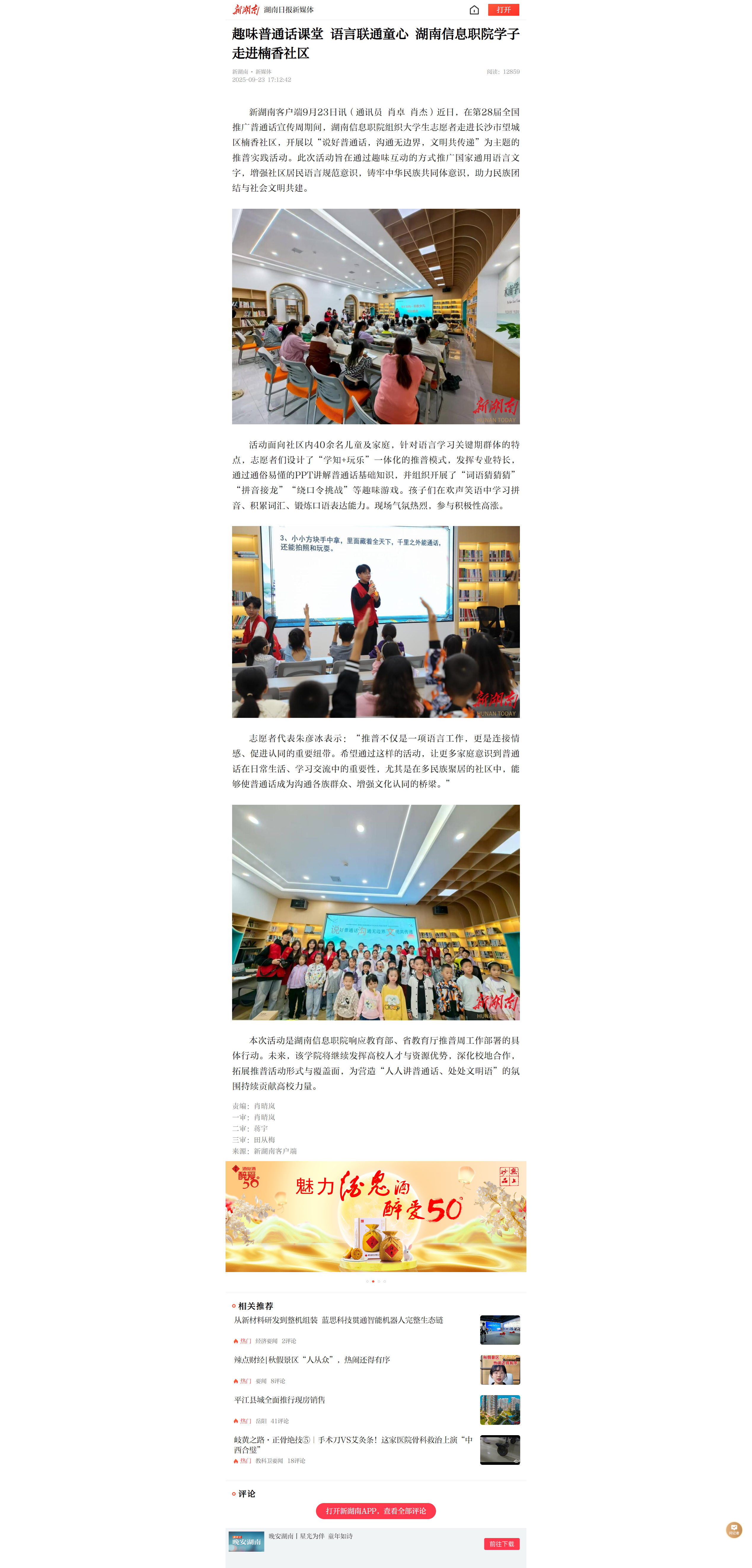 9月23日,新湖南发布《趣味普通话课堂 语言联通童心 湖南信息职院学子走进楠香社区》