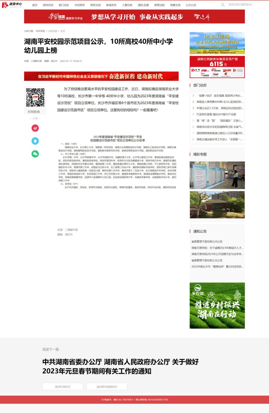 1月17日,红网发布《湖南平安校园示范项目公示,10所高校40所中小学幼儿园上榜》