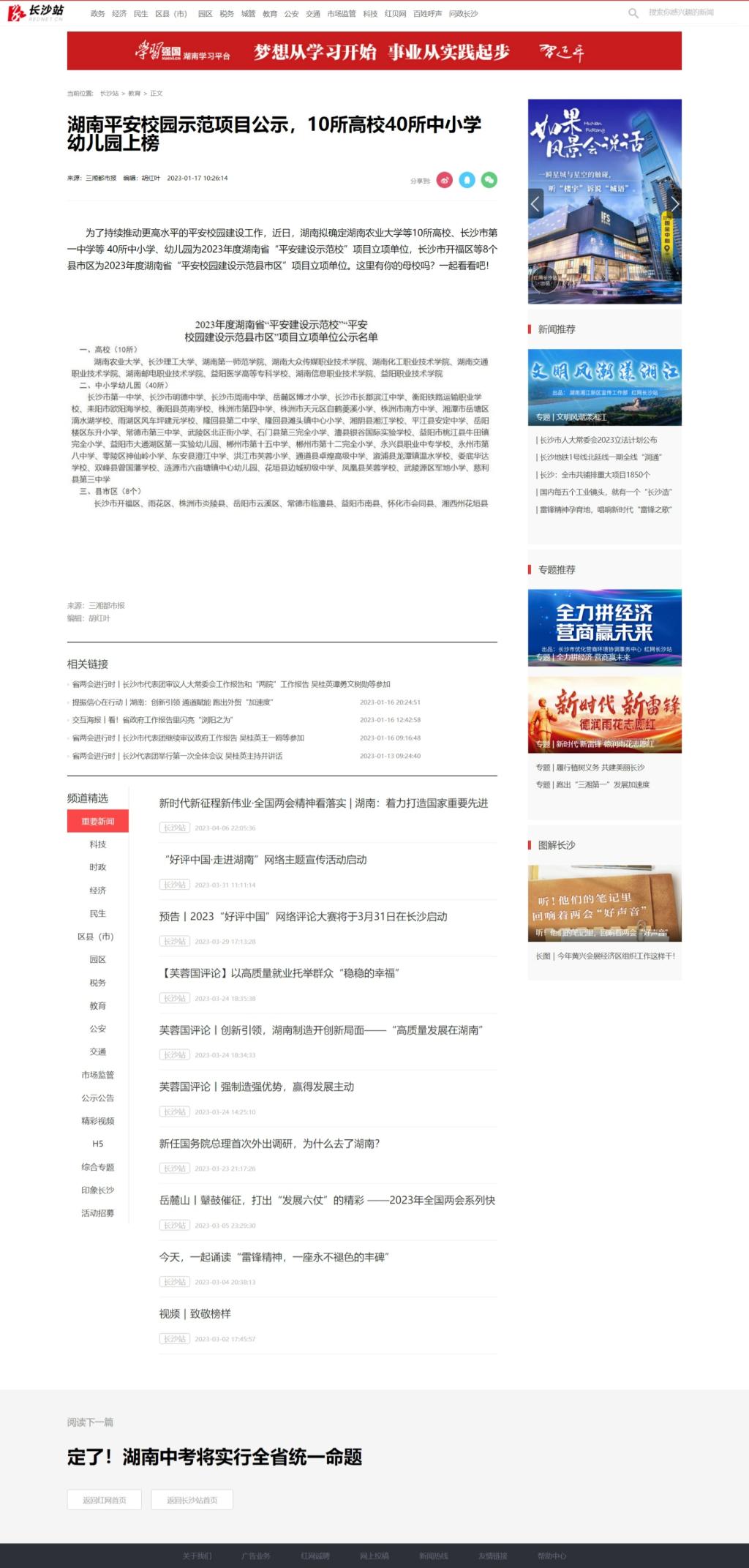 1月17日,红网发布《湖南平安校园示范项目公示,10所高校40所中小学幼儿园上榜》