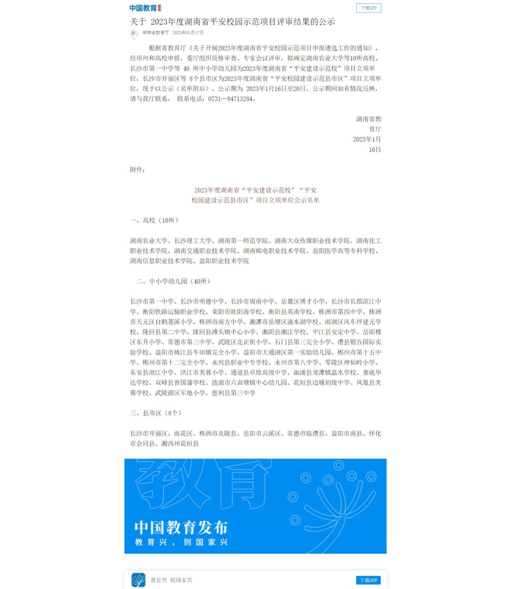1月17日,中国教育发布客户端发布《关于 2023年度湖南省平安校园示范项目评审结果的公示》