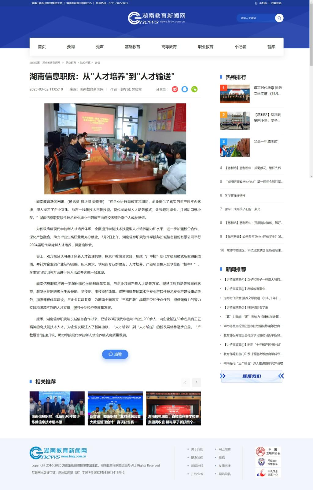 3月2日,湖南教育新闻网发布《湖南信息职院:从"人才培养"到"人才输送"》