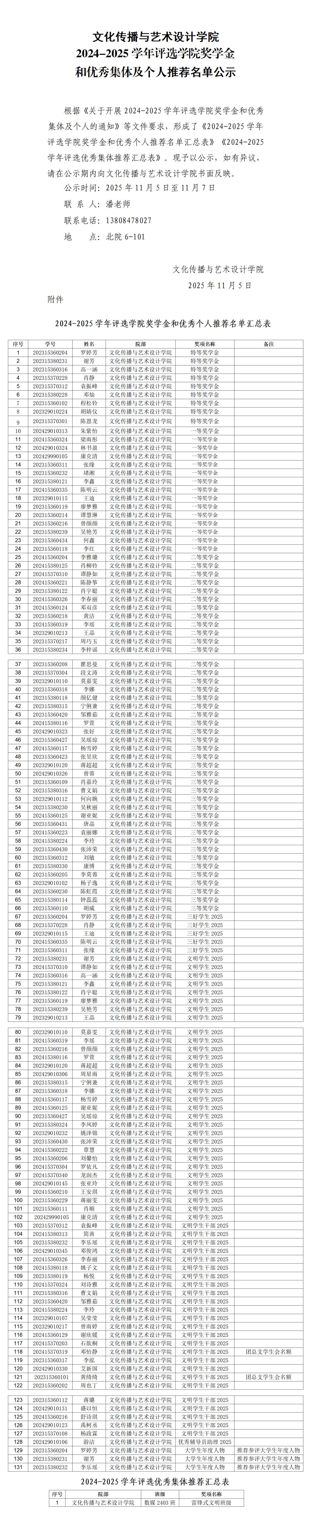文化传播与艺术设计学院2024-2025学年评选学院奖学金和优秀集体及个人推荐名单公示