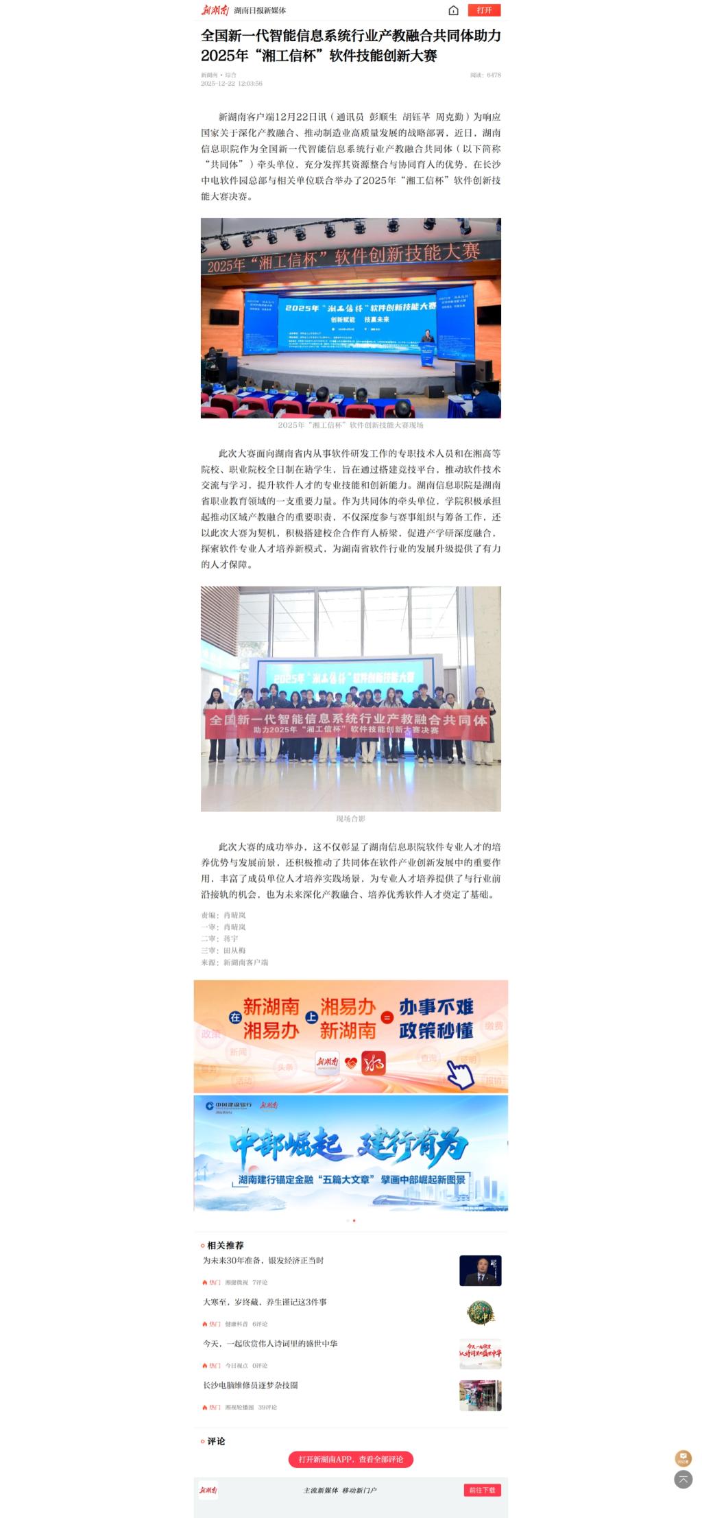 12月22日,新湖南发布《全国新一代智能信息系统行业产教融合共同体助力2025年“湘工信杯”软件技能创新大赛》